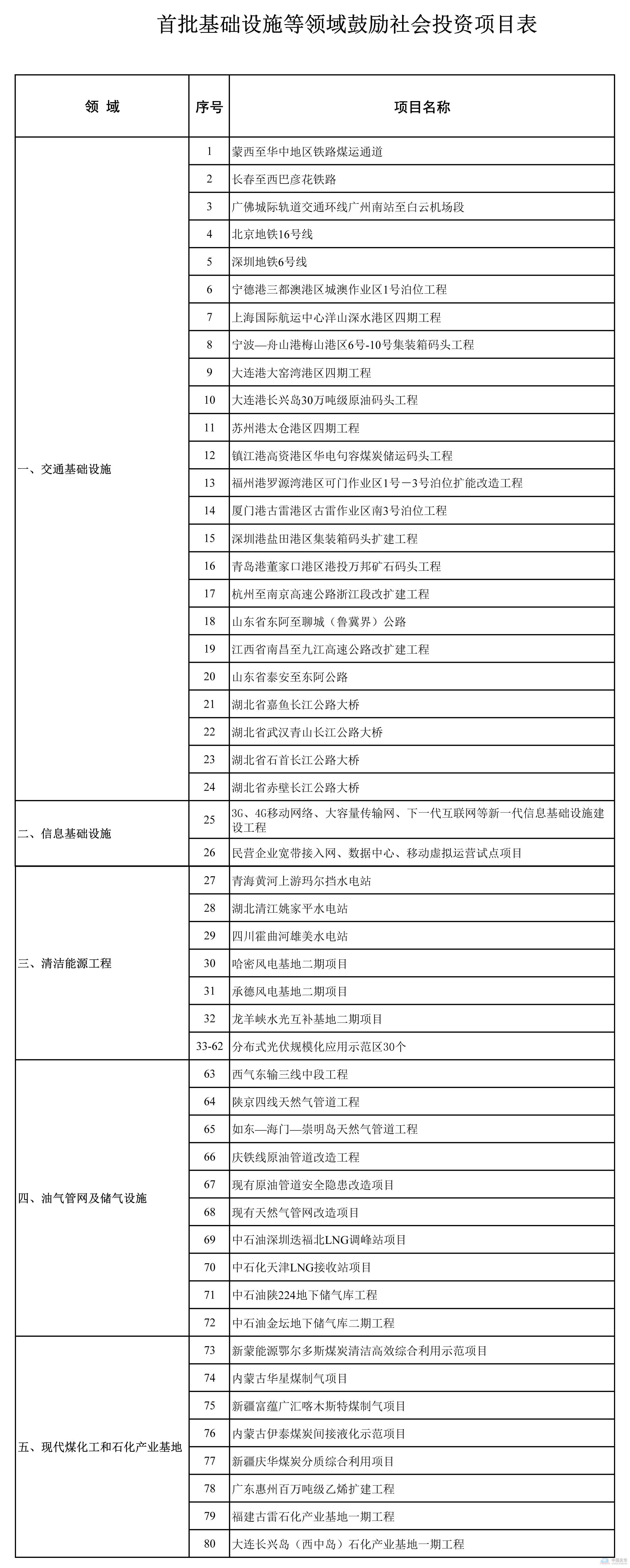 一、首批推出的基礎設施等領域鼓勵社會資本參與的80個項目涵蓋鐵路、公路、港口等交通基礎設施,新一代信息基礎設施,重大水電、風電、光伏發電等清潔能源工程,油氣管網及儲氣設施,現代煤化工和石化產業基地等方面,鼓勵和吸引社會資本特別是民間投資以合資、獨資、特許經營等方式參與建設及營運。